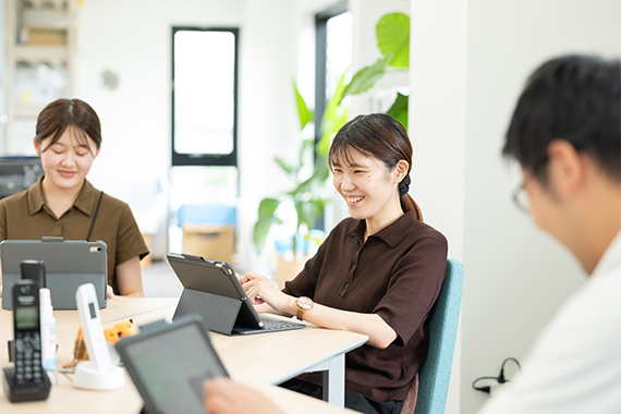 スタッフ一人ひとりのがんばりが正当に評価される環境を実現するため、給与制度の充実化に努めています。仕事や給与について定期的に面談を行って、各自の業績や働きぶりをきちんと評価した上で、昇給・賞与(各年2回)に反映します。